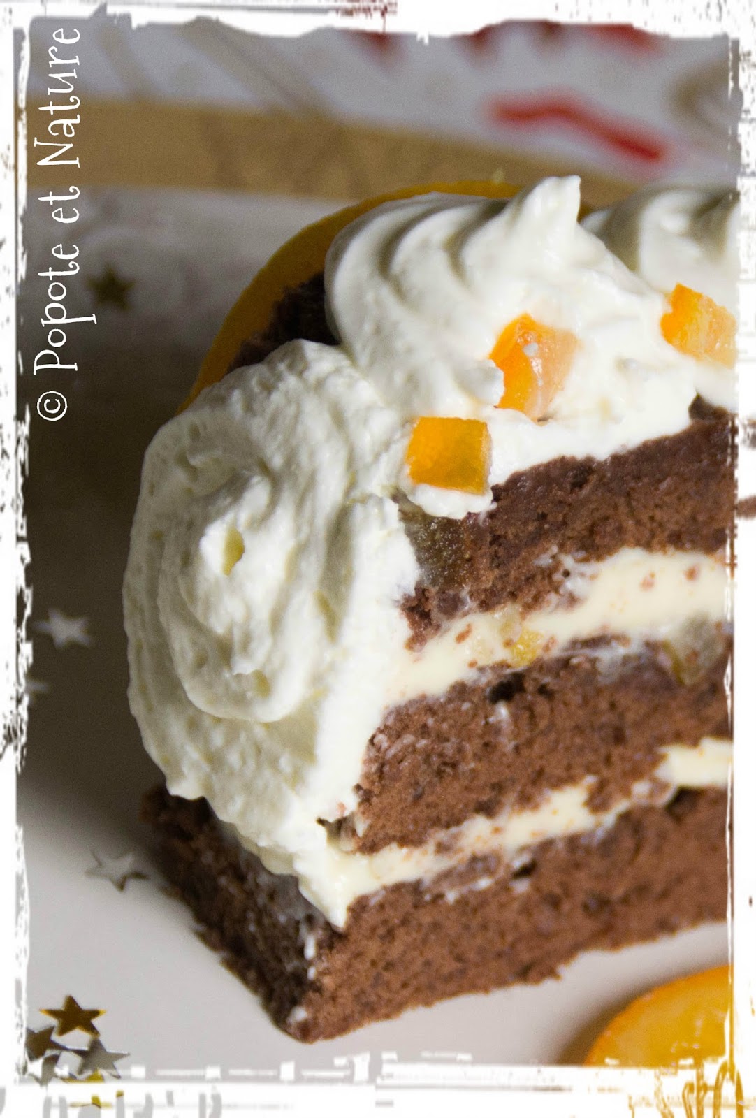 Le gâteau est bien chocolaté et moelleux, une ganache au chocolat blanc et un jus au jus d'orange apporte une note acidulé à ce moelleux. C'est le moment de commencer à réaliser vos premières oranges confites pour la saison.
