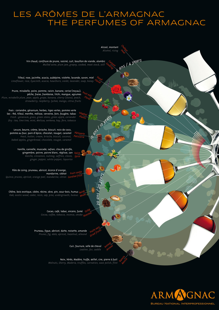Lorsque l'Armagnac est âgé, ses arômes deviennent de plus en plus complexes, évoluant sur des parfums de bois exotiques, cacao, café, pruneau, et finalement terminer avec une pointe de truffe !